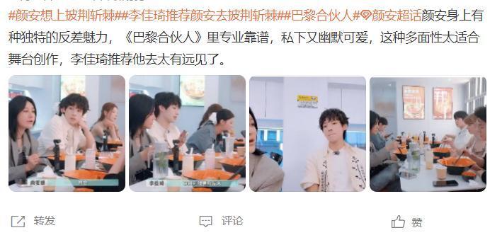 在聊天的过程中,李佳琦表示:颜安很适合录制《披荆斩棘》,听到李佳琦的话,颜安立即表示:自己很想去《披荆斩棘》,因为他喜欢在舞台上的感觉。