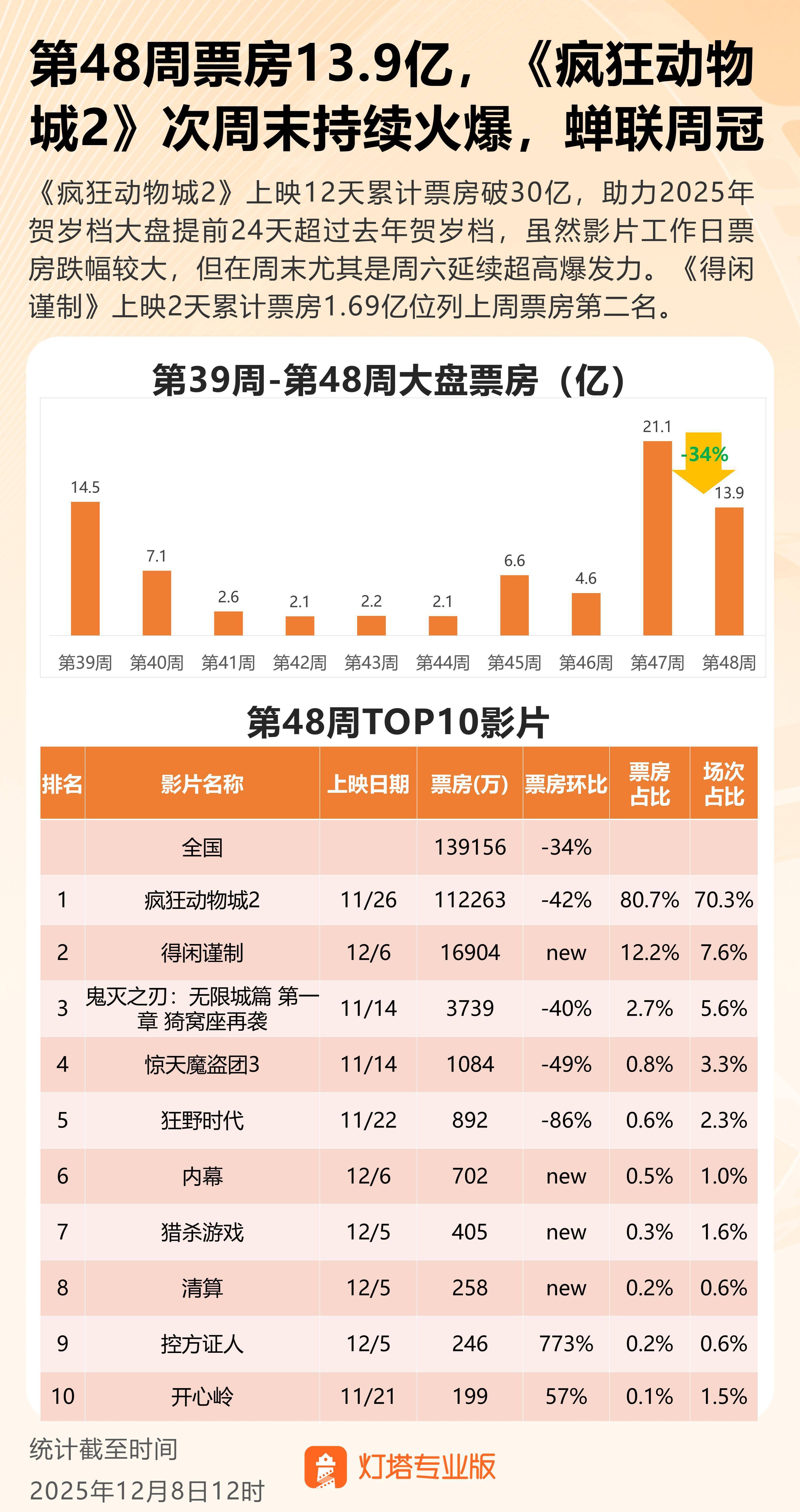 牛壹佰配资 周报丨《疯狂动物城2》蝉联周冠,助力贺岁档票房提前超越去年
